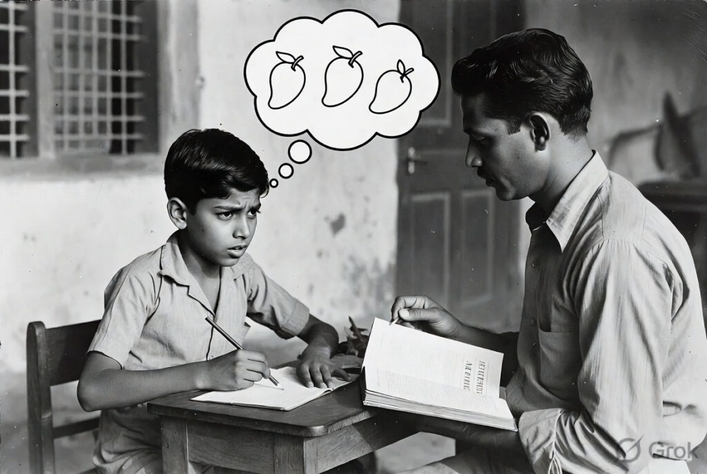 Swami, however, is a child of Malgudi whose mind naturally wanders into stories, characters, and sensory details. The problem about mangoes becomes, for him, a miniature drama about people, fruits, and fairness, not a neat equation. As the father’s gaze grows heavier and the silence stretches, Swami’s anxiety amplifies until he can no longer function “logically.” His tears are the collapse of performance under pressure, not laz spices.